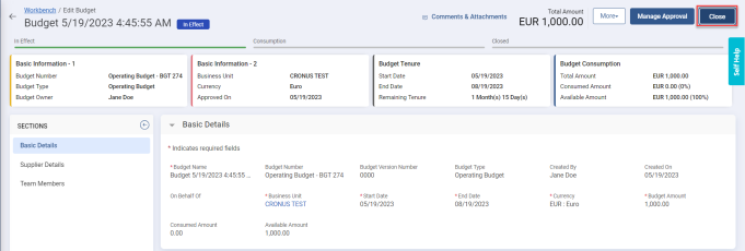 Click Close. The budget goes into Closed state.
