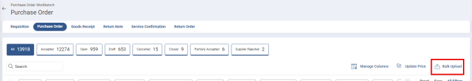 The Bulk Upload page allows you to download the template that includes the details required to create a PO through bulk upload functionality. The columns in the template are similar to those in the UI.