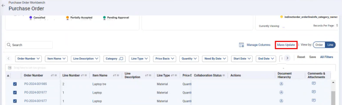 The Mass update allows you to take actions on multiple orders at the same time, including those at the header and line levels. You can perform both header and line levels from the workbench itself.
