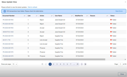 Transaction Message – Indicates the message for failed actions. You can click Document Number and perform the same action for the individual document.
