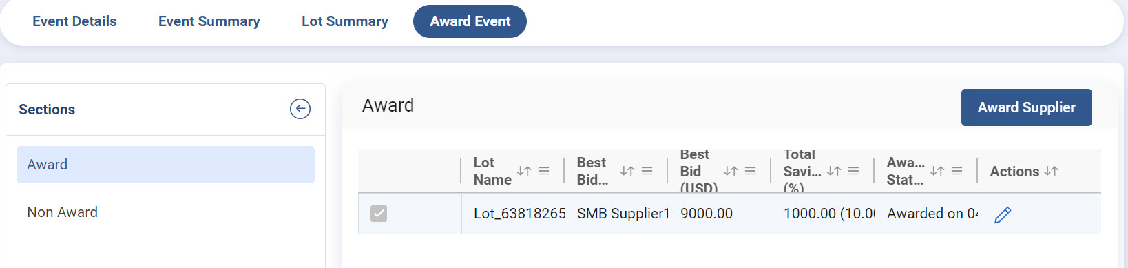 1. Select the required lot row(s) and click Award Supplier.