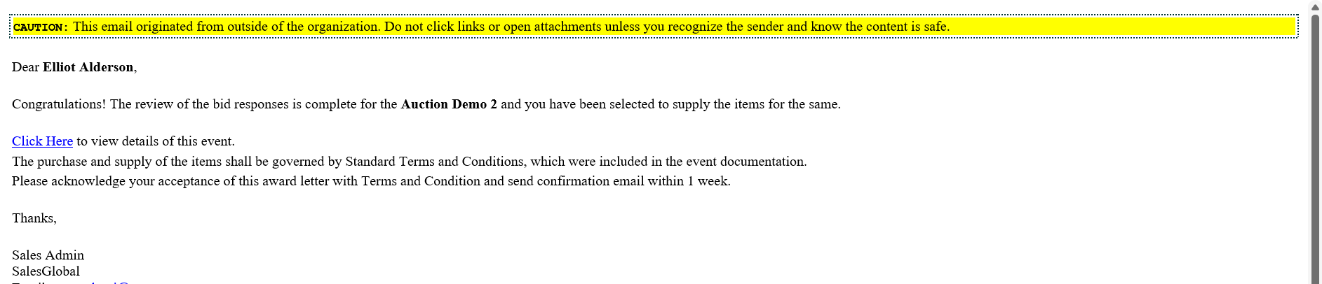 The awarded supplier will receive an email notification like this: