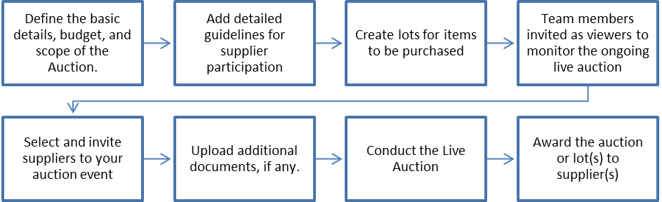 Creating an Auction event involves tasks such as setting up the event, specifying the items to be purchased, inviting suppliers, compiling the final information of the bids, and awarding a supplier.