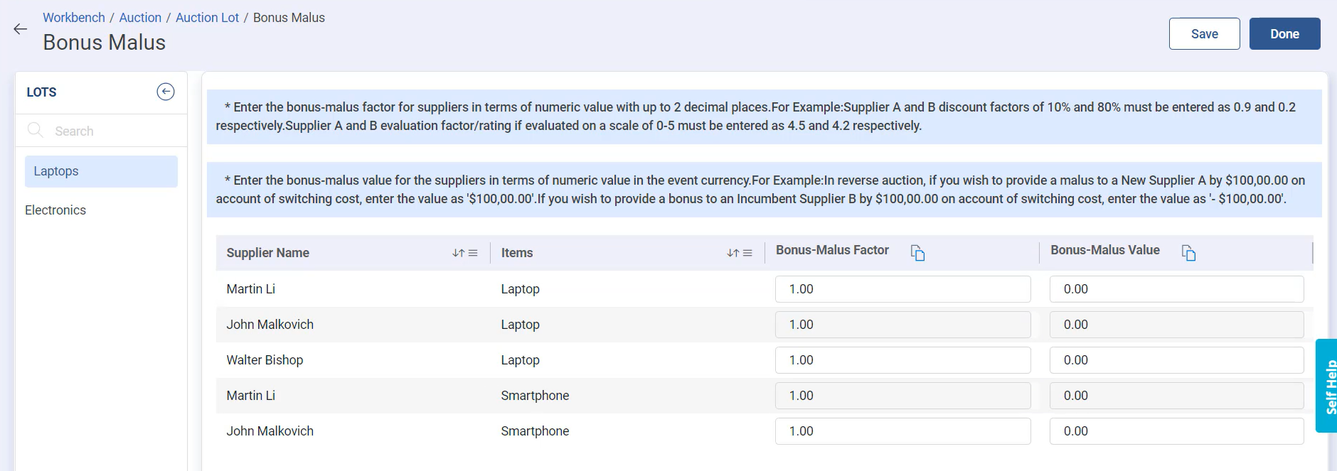 Now, for each supplier in this event, you can individually specify the Bonus Malus Factor and Bonus Malus Value based on your specific requirements.