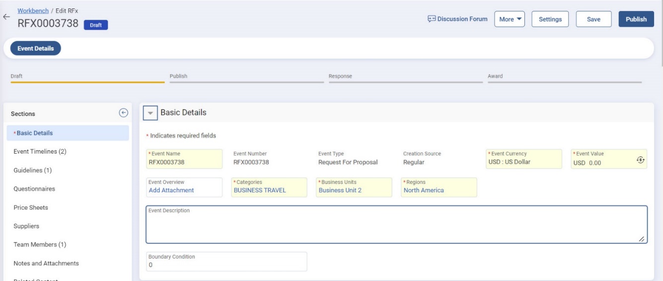The Basic Details section lets you capture the basic information such as name, event currency, event value, description, type of auction along with the category, business unit, and region scope of the event.