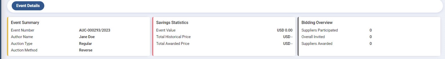 The Event Details tab on the Auction page summarises the entire auction event in the form of cards before the section begins. It gives an overview of the event summary, savings statistics, and bidding in the event.