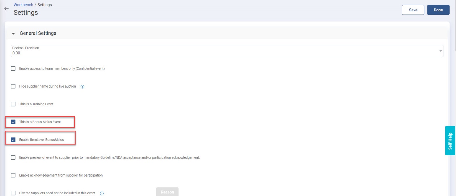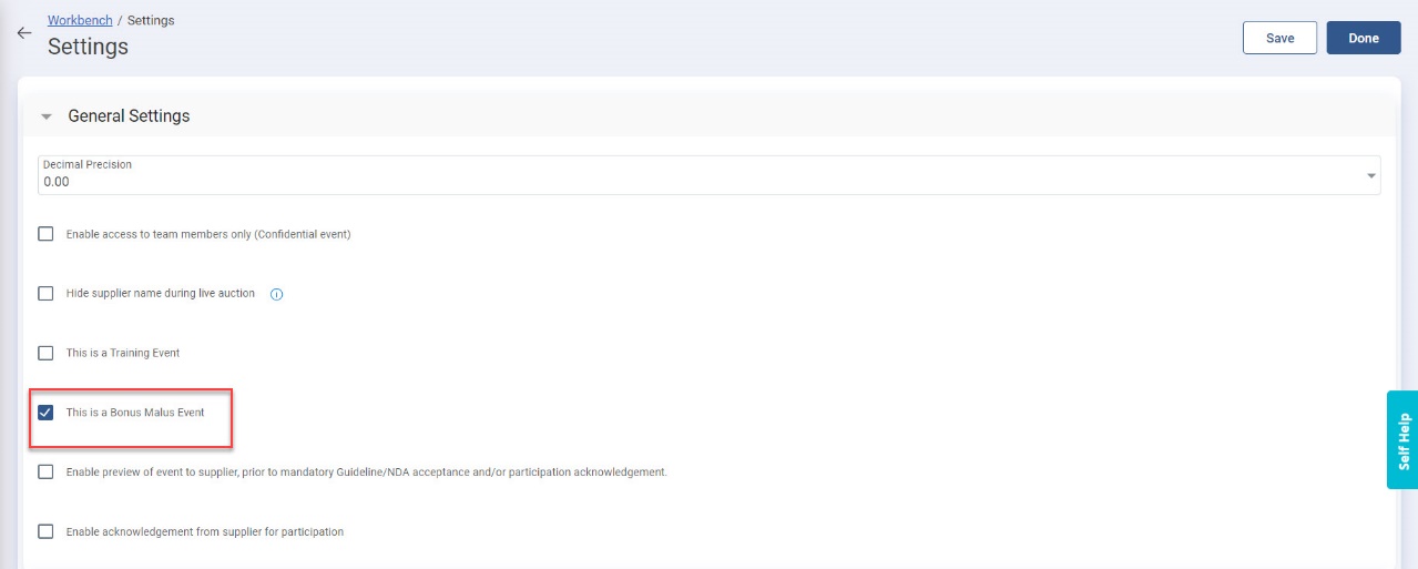 Enables you to manage the general setting such as decimal precision, supplier name visibility, marking auction event as a training event, and NDA settings. Also contains the option to set up a Bonus Malus event. For more information, refer… |
