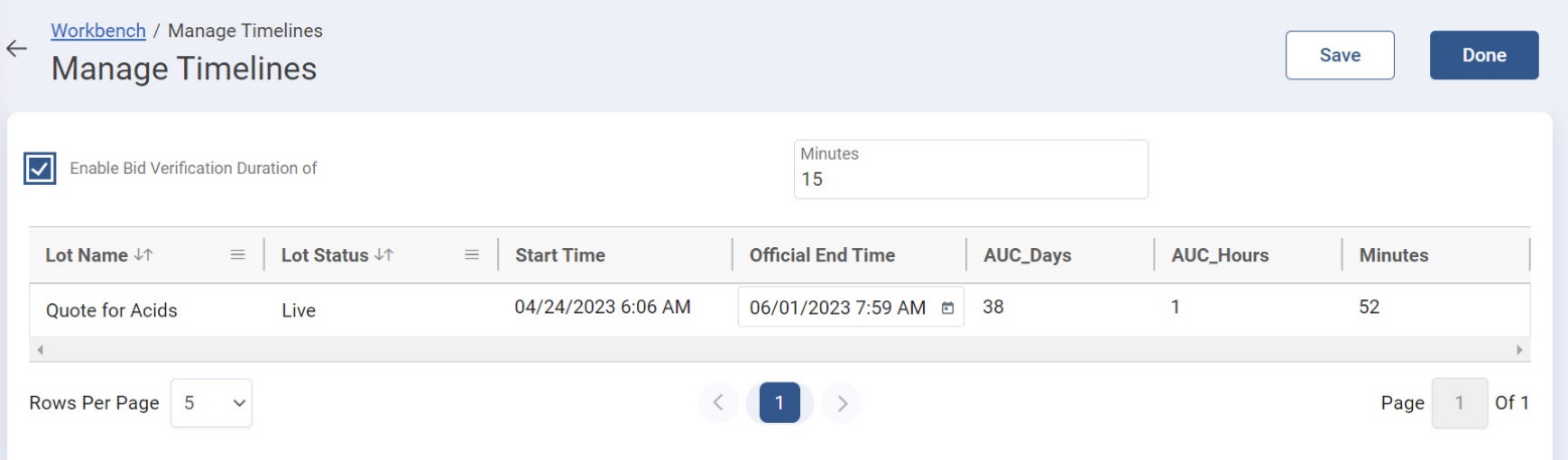 On the subsequent Manage Timelines page, make the required changes to the Start Time and End Time by clicking the Edit icon against the required lot.
