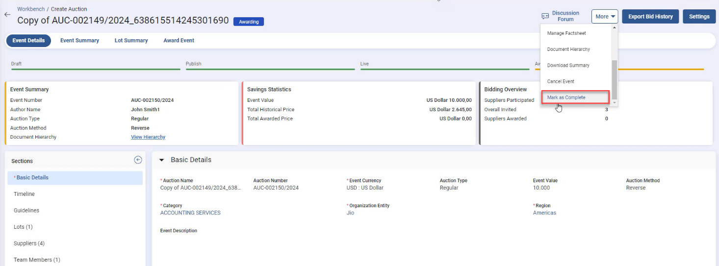 The Mark as Complete option is available once the auction is in Awarding or Awarded status.