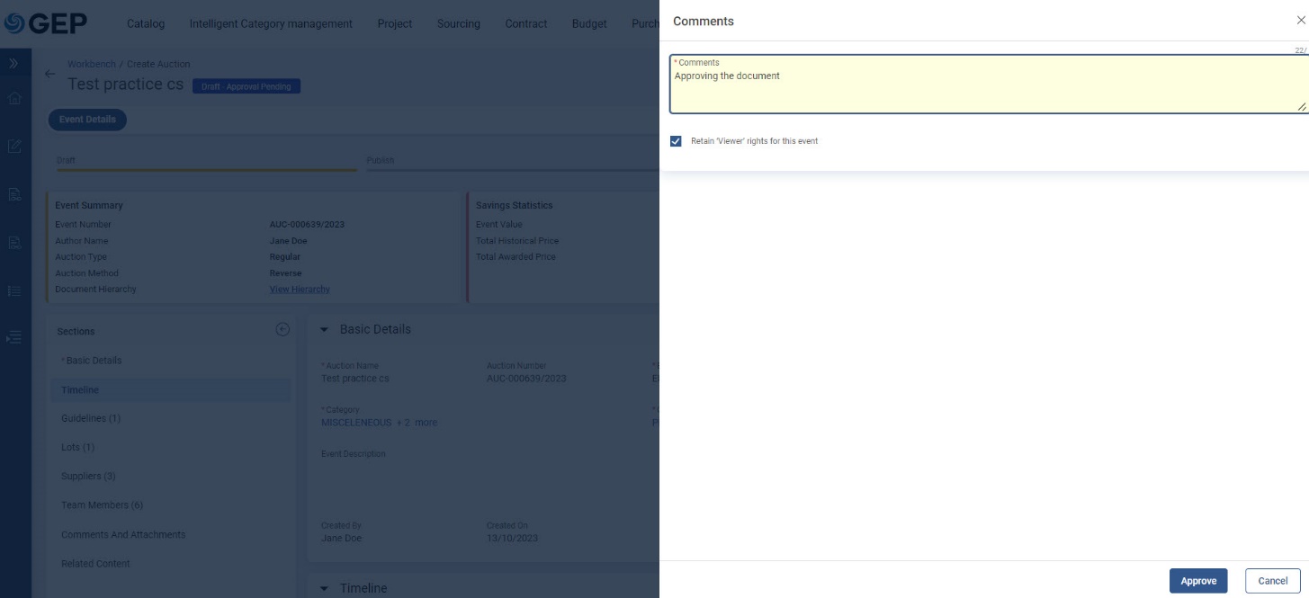 Open the Auction document that you want to approve/Reject. Ensure that the Auction is in the Draft – Approval Pending state.