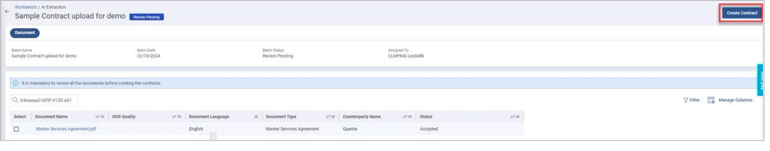 1. Clicking on the Batch Number redirects you to the extraction page, where you can review and accept the extracted data from the contract.
